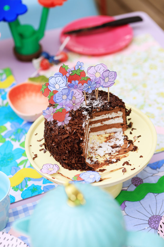 Pour un rendu encore plus bucolique j’ai mixé les fleurs simples et des fleurs en duo avec des fraises, le tout en rappel avec les coupelles de la vaisselle et j’adore le rendu global de la scénographie de la table ! Les filles ont adoré tout planter, coller et surtout tout manger ^^