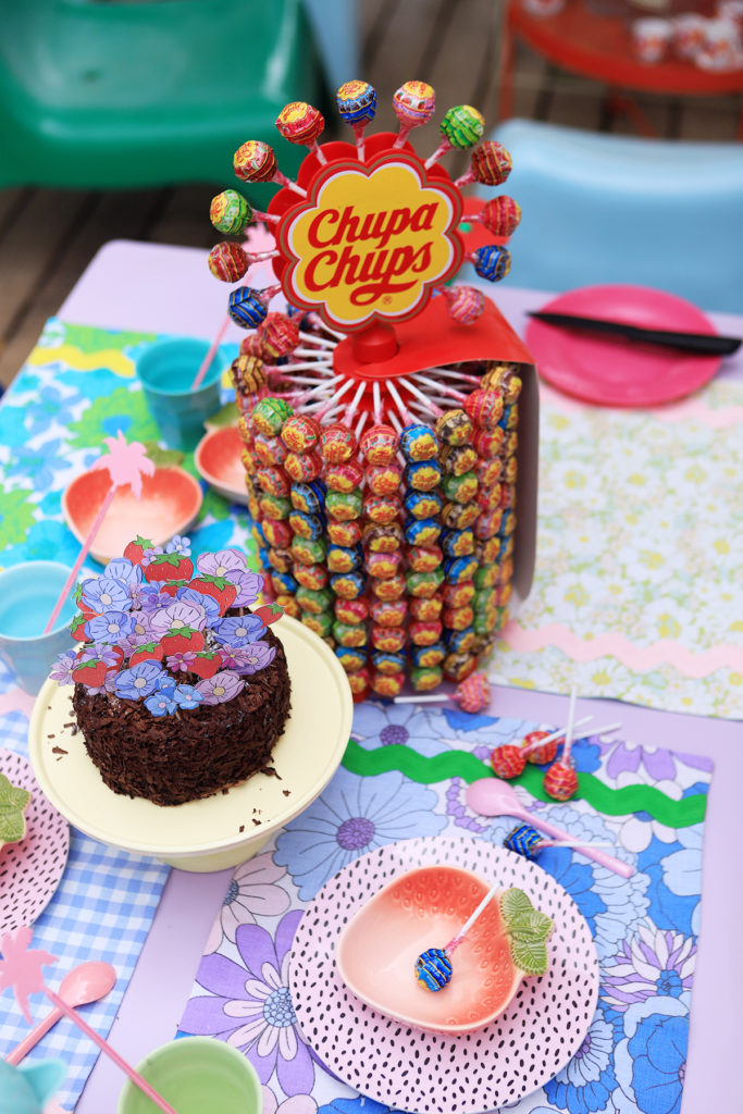 Pour la décoration, j’ai joué avec des set de table en tissu vintage de Lea Sionneaux X Girlz POP qui j’adore, j’ai rajouté une tour de Chupa Chups que m’a envoyé la marque et hop !