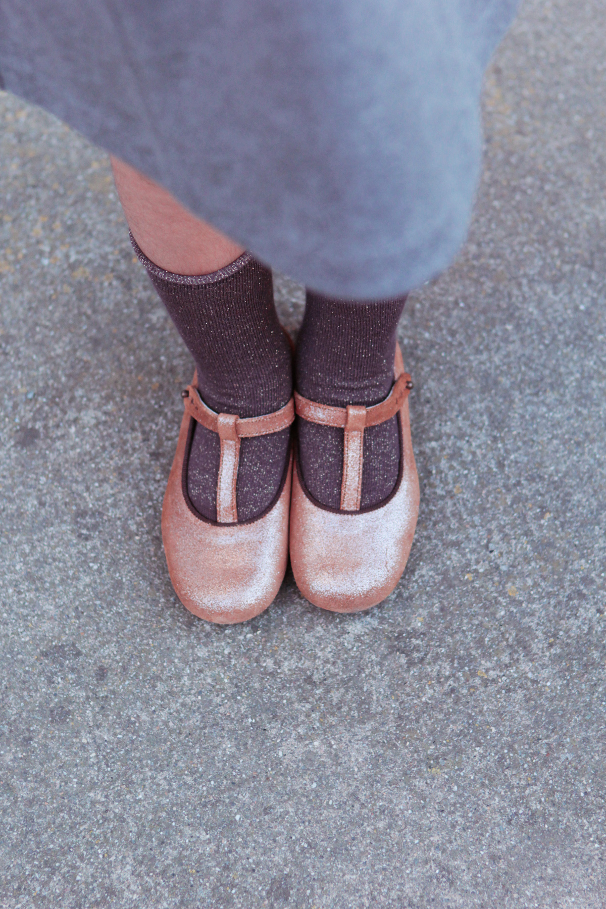 Total look offert par Cyrillus avec une robe d’amour Cyrillus X ELLE, des salomés irisées et des chaussettes en lurex parfaites pour un look rétro de presque petite fille sage…