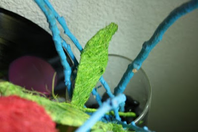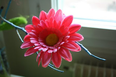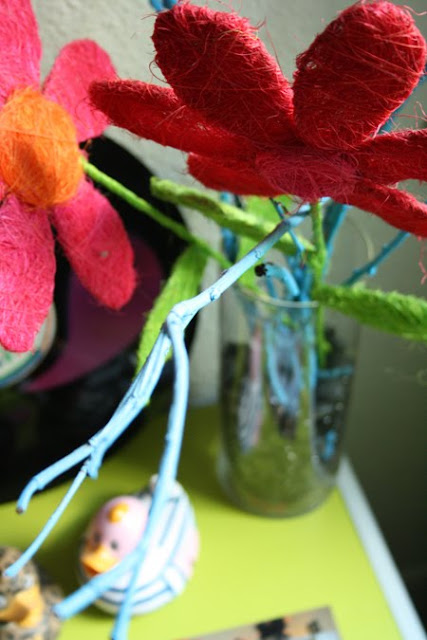 Pour égayer j’ai rajouté des fausses fleurs bien kitch et au fond du vase du sable coloré et des galets pour caler les branches (plus pratique quand on a un chat un peu idiot qui tire sur les branches).