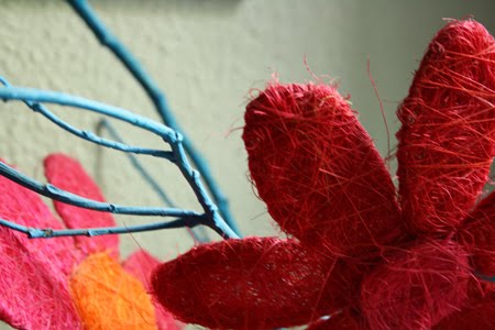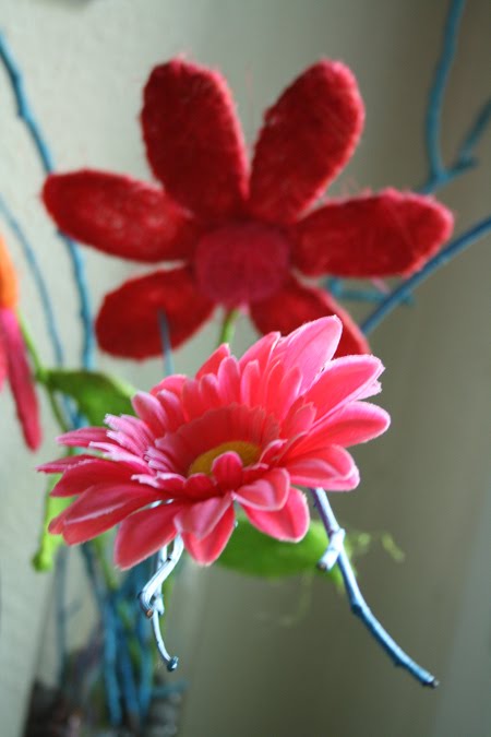Pour égayer j’ai rajouté des fausses fleurs bien kitch et au fond du vase du sable coloré et des galets pour caler les branches (plus pratique quand on a un chat un peu idiot qui tire sur les branches).